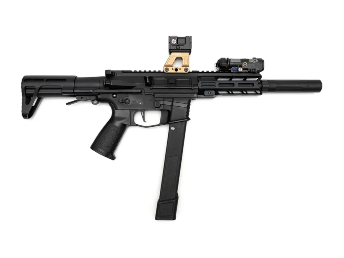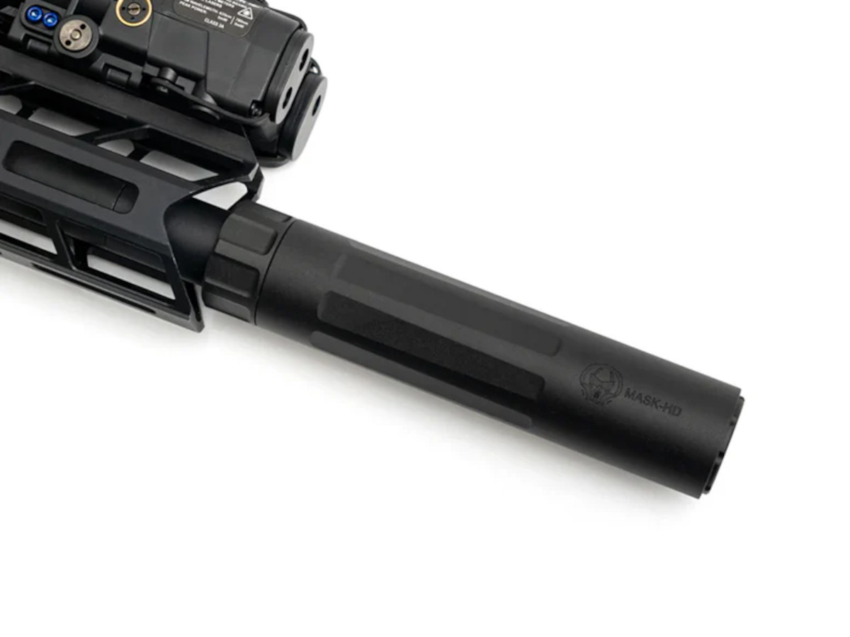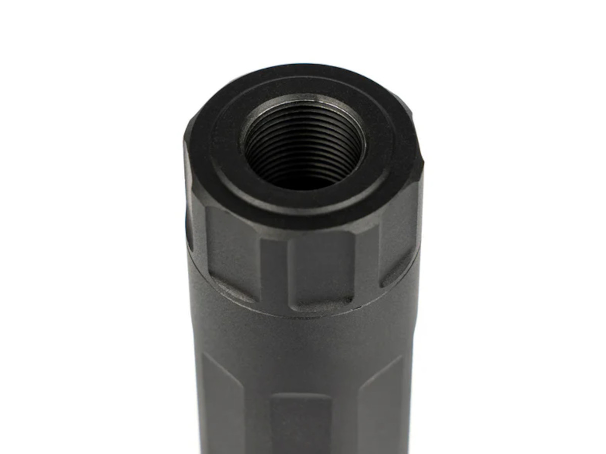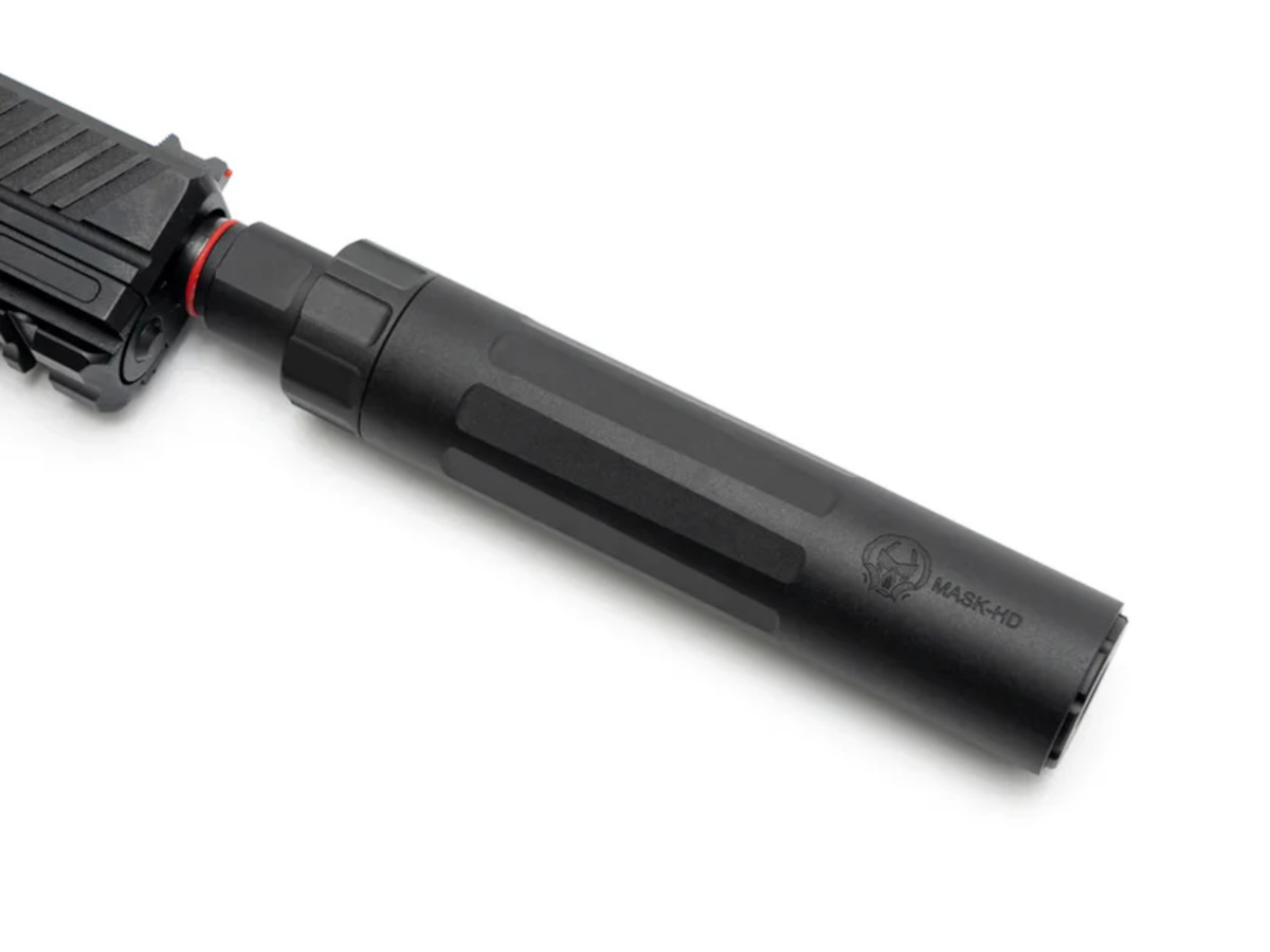 PTS Dead Air Mask モックサプレッサーは、エアソフト用のハンドガンだけでなく、ライフルにも適した軽量・コンパクトなサプレッサーです。非常に軽量なため、ハンドガンに装着してもフロントヘビーになりにくく、ブローバック作動を妨げないのが特徴です。さらに、ハンドガン特有のティルト(傾き)や軽い後退動作に対応するため、本体には専用アダプターが付属しています。これにより、発射時にサプレッサーがフレームに干渉するリスクを減らし、安全かつ確実に装着できる構造になっています。