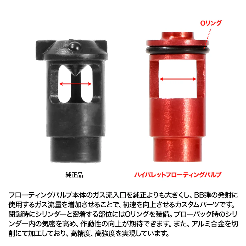 フローティングバルブは、BB弾を発射するためのガス流量やブローバック時のシリンダーの気密に関わる重要なパーツです。本製品はフローティングバルブ本体のガス流入口を純正よりも大きくし、BB弾の発射に使用するガス流量を増加させることで、初速を向上させるカスタムパーツです。閉鎖時にシリンダーと密着する部位にはOリングを装備。ブローバック時のシリンダー内の気密を高め、作動性の向上が期待できます。また、アルミ合金を切削にて加工しており、高精度、高強度を実現しています。