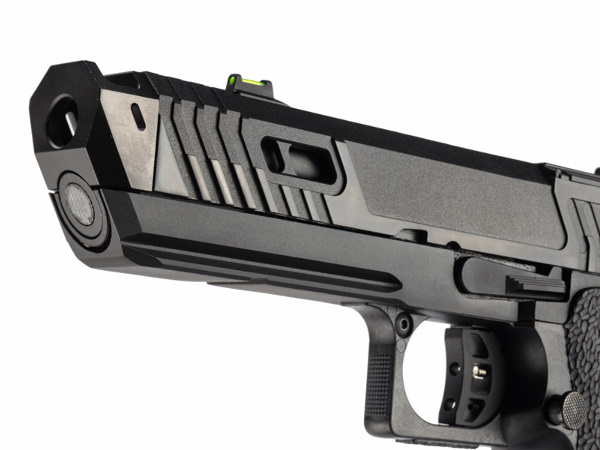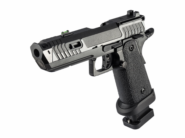 BT-SAND VIPER CO2GBBは、このTTI SAND VIPERの魅力をCO2ガスガンとして忠実に再現。実銃同様ドットサイトを搭載出来るスライド上部は、金属製のプレートをインサート成型することで強度を確保。また、ドットサイトが無くてもねらい撃てるように、オリジナルのリアサイト付きスライドカバー(+オプティックプレート3種類)と集光フロントサイトが付属。BKモデルはマガジンボディもブラック