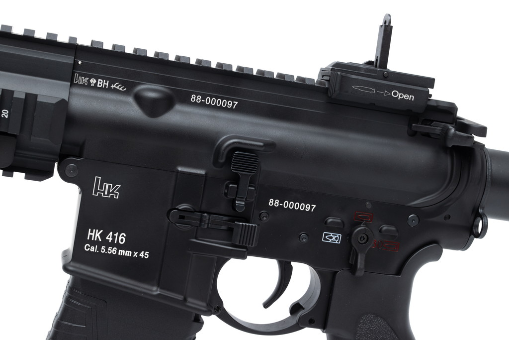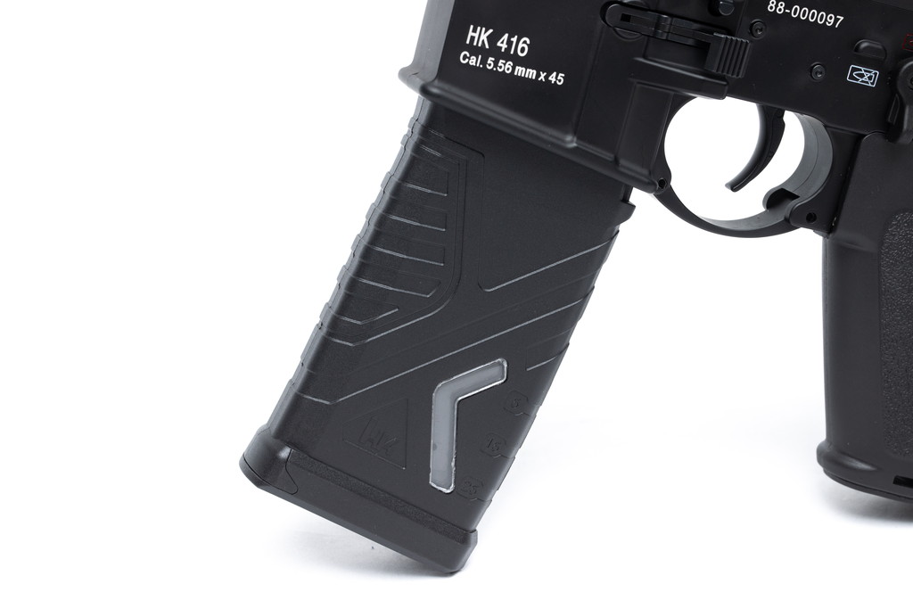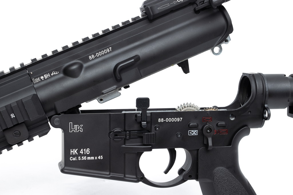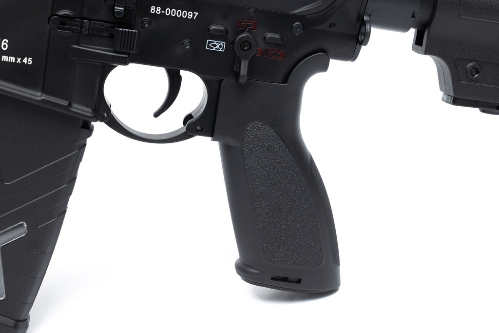 トリガーはColt M4系の流用ではなく、実銃のHK416A5に標準搭載されているオリジナル形状(後ろ側に切り欠きがある)ものを再現。