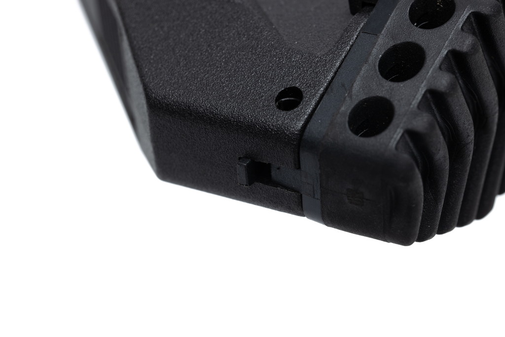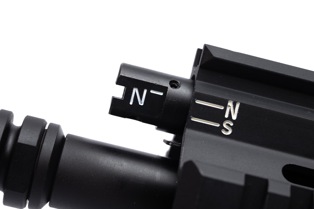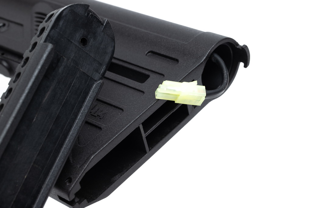 C.A.T.では一般的な電動AR15レシーバーの寸法でリアルなテイクダウン機構を再現するために、ピストンストロークのショート化を行いアッパーメカボックス後端を短縮しました。