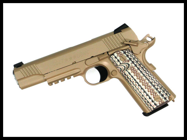 米海兵隊がMEUピストルの後継として制式採用に踏み切ったM1911系45口径自動拳銃『M45A1 CQBP』。M1911系のオリジナルメーカーであるコルト社が同社のXSE/レイルガン系をベースに海兵隊からの要求を盛り込んで開発した特別仕様モデルで、砂漠戦を意識したデザートタンカラーのカラーリングとウェポンライトの装着に対応したダストカバー部のアクセサリーレイルが外観上の特徴となっています。