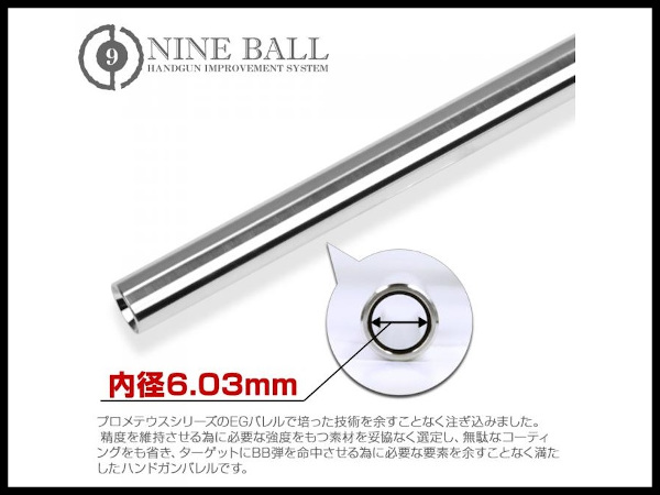 内径6.03mm寸法誤差100分の1mmという最高精度を有し、その精度を維持させる為に必要な強度をもつ素材を妥協なく選定し、無駄なコーティングをも省き、ターゲットにBB弾を命中させる為に必要な要素を余すことなく満たしたハンドガンバレルです。