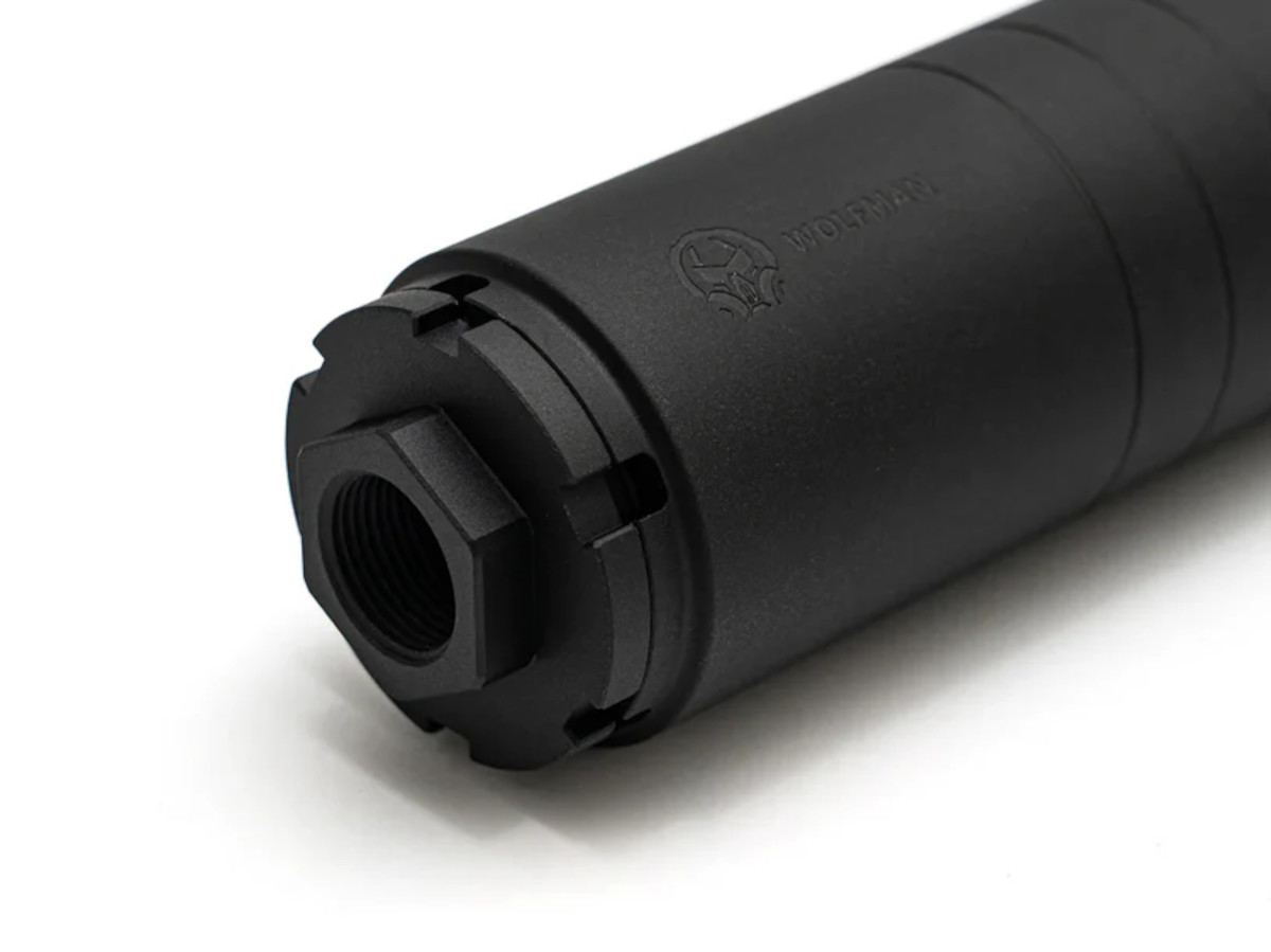 PTS Dead Air Wolfman トレーサーは、エアソフト用サブマシンガン、ライフル、ハンドガンに対応した、軽量・モジュラー構造のダイレクトスレッドタイプのモックサプレッサーです。本体は6061アルミからCNC削り出しで製作され、ハードアルマイト仕上げを採用。耐久性と軽量性のバランスに優れ、着脱や構成変更がしやすいモジュラー設計となっています。