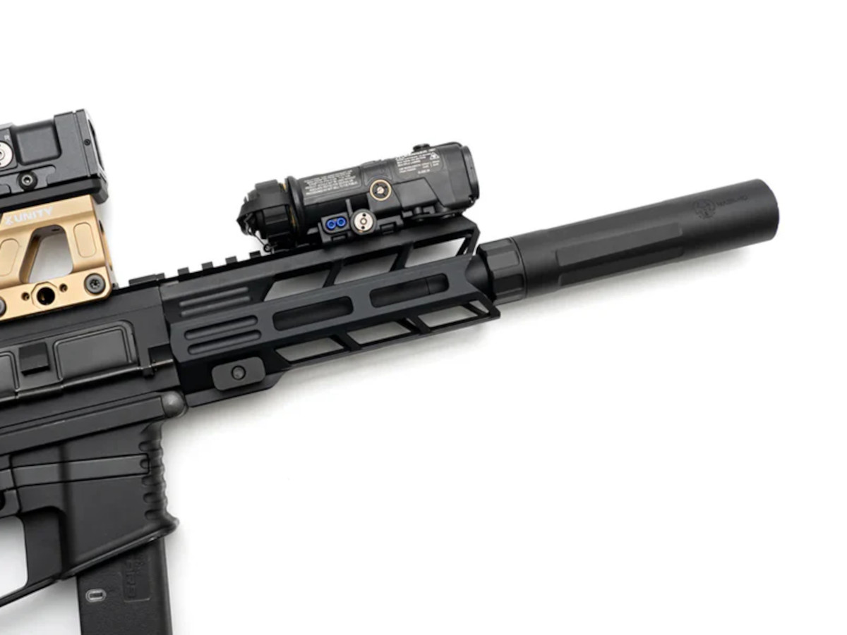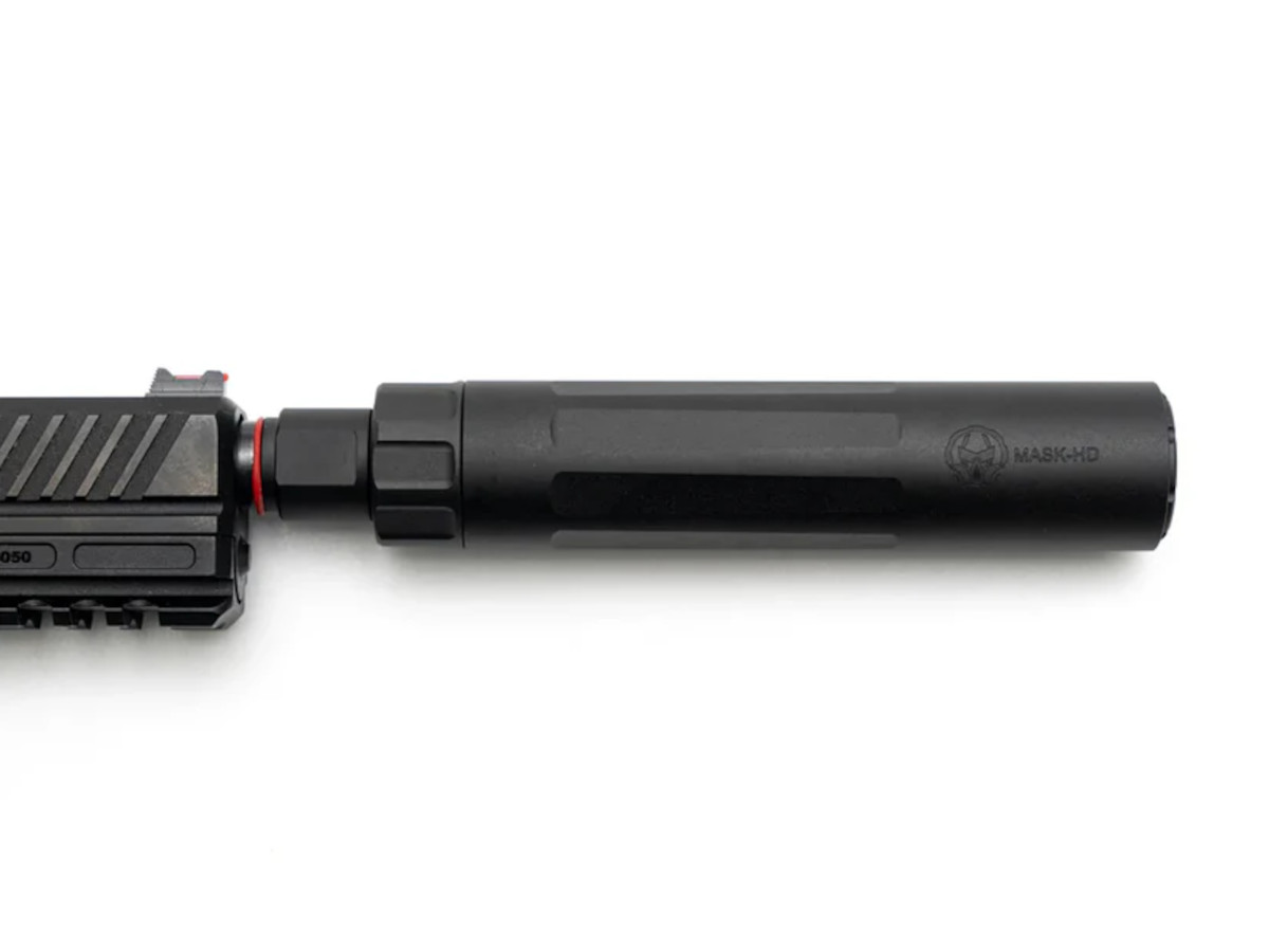 PTS Dead Air Mask モックサプレッサーは、エアソフト用のハンドガンだけでなく、ライフルにも適した軽量・コンパクトなサプレッサーです。非常に軽量なため、ハンドガンに装着してもフロントヘビーになりにくく、ブローバック作動を妨げないのが特徴です。さらに、ハンドガン特有のティルト(傾き)や軽い後退動作に対応するため、本体には専用アダプターが付属しています。これにより、発射時にサプレッサーがフレームに干渉するリスクを減らし、安全かつ確実に装着できる構造になっています。