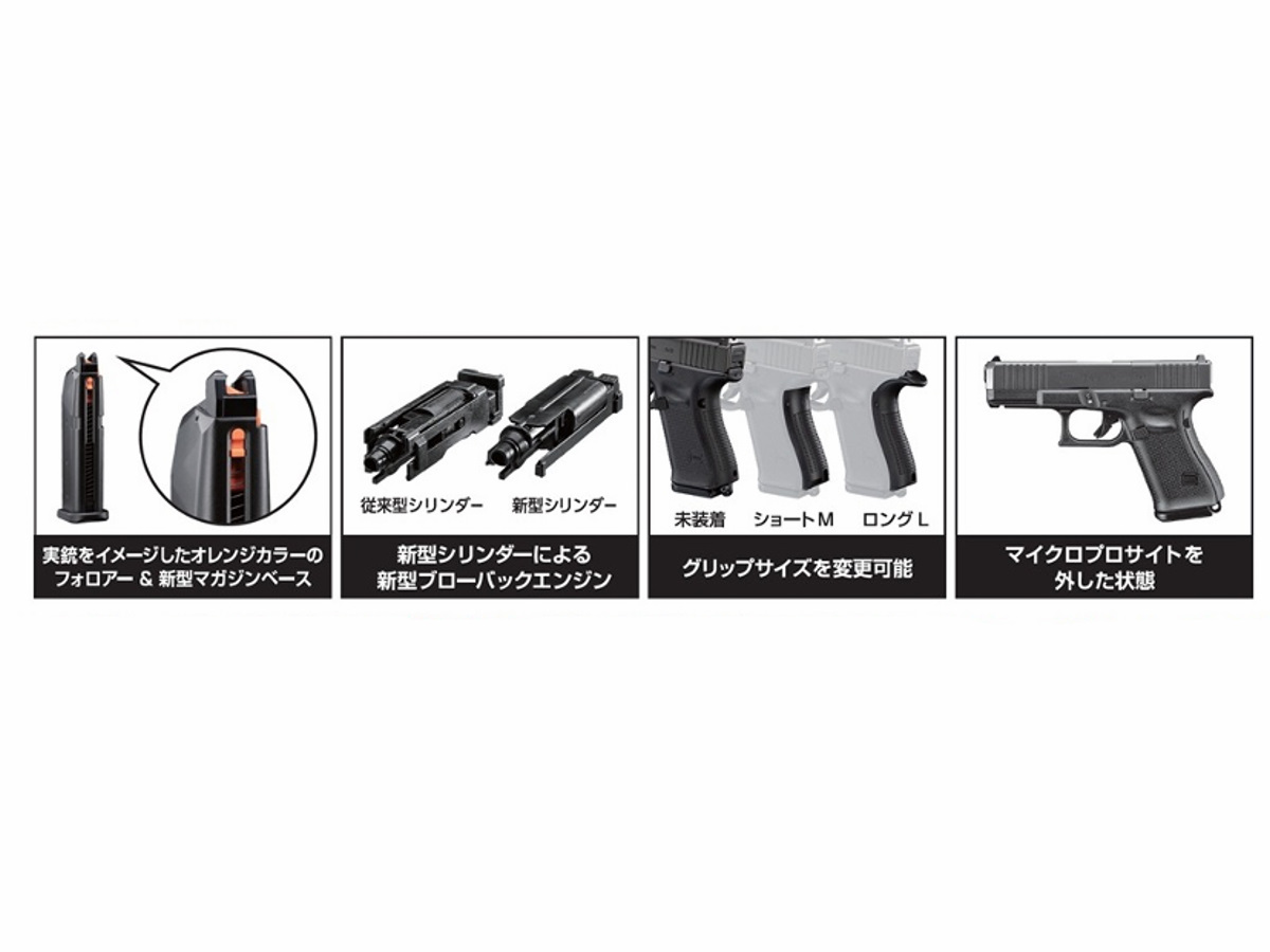 スライドフロント部の変更点(面取りやセレーションの追加)や、フィンガーチャンネルのないグリップ、アンビ仕様になったスライドストップなど、G19第5世代(Gen5)の特徴を再現しています。