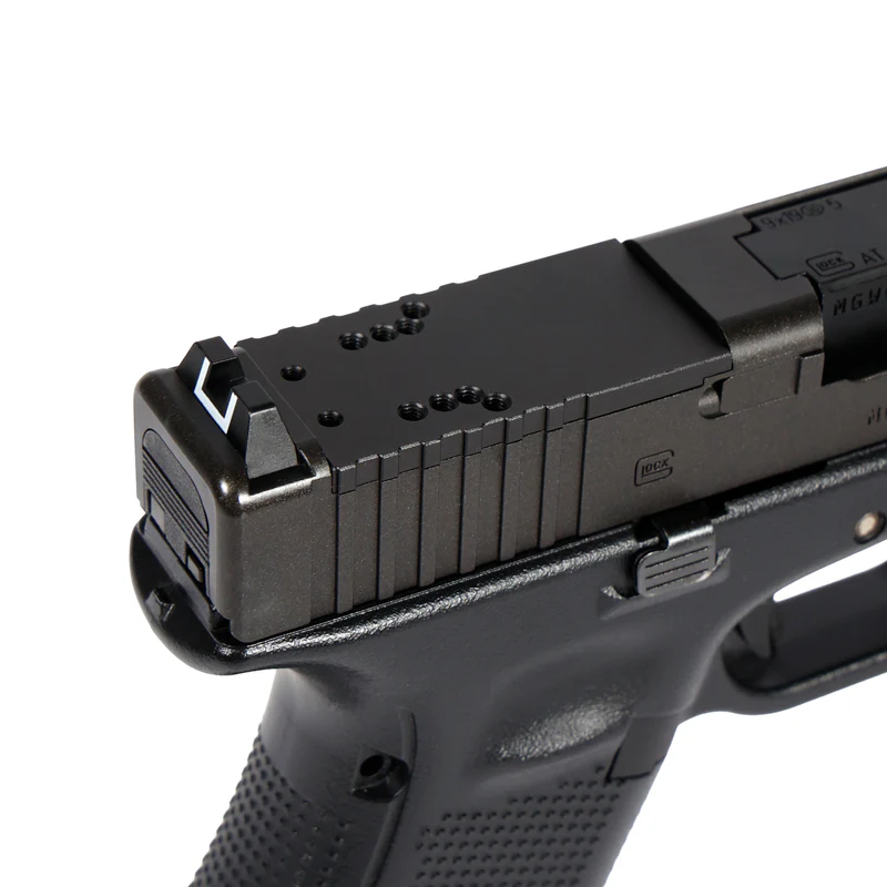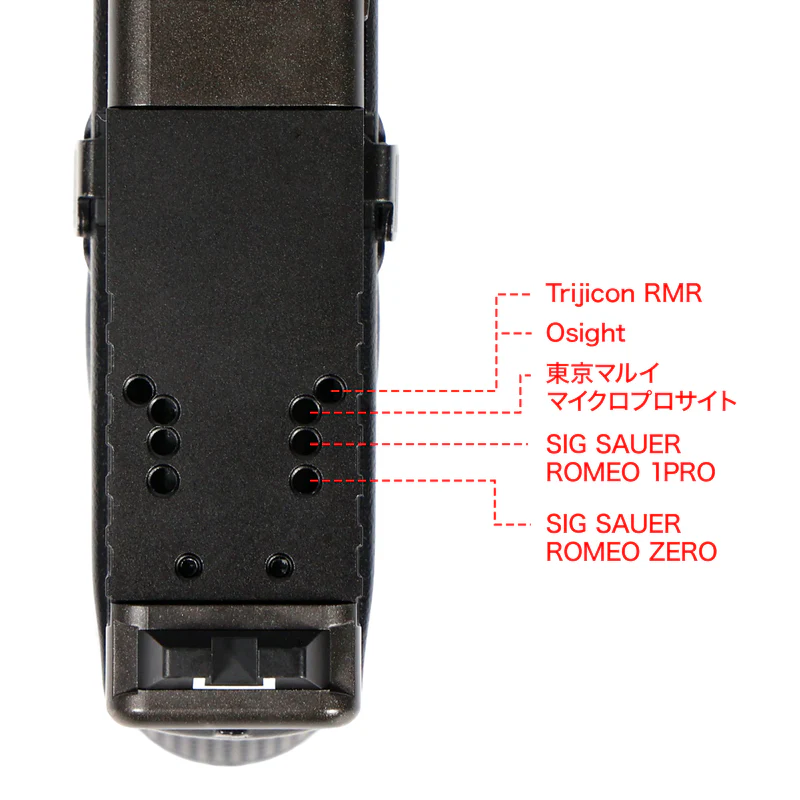 東京マルイ G17 Gen5 MOS、G19 Gen5 MOSに同社製マイクロプロサイト、Trijicon RMR、Osight、ROMEO 1PRO、ROMEO ZEROやそれらと同規格の光学機器を搭載できるマウントプレートです。素材には軽量かつ剛性が高いアルミ合金を採用。マウントプレート自体のたわみを防止し、スライドに光学機器を強固に固定できます。当製品のみ組込んだ際(ダットサイト非搭載時)の重量は純正状態と同等。スライドの作動性に対する影響を抑えています。